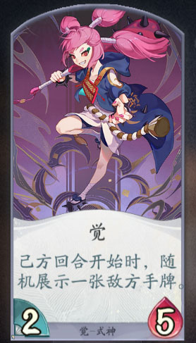 《阴阳师百闻牌》是一款无套路妖怪卡牌对战手游(CCG)。逾百位顶级画师,以匠心绘制的精美卡牌,演绎《阴阳师》中耳熟能详的经典角色。置身穿行三界的秘境楼船中,化身为妖,与百鬼共游,以全新的原创规则展开燃情对决。想上分的话,就需要一个最适合你的阵容卡组,同时还要了解每位式神的能力才能更好的发挥出每位式神的作用!觉是最近的测试本更新中加入阴阳师百闻牌的十位新式神之一。她是一位可以帮玩家获得更多战场信息并