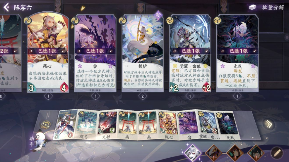 白狼是一个需要良好输出环境才能发挥作用的式神,很多小伙伴不知道应该怎么为她搭配阵容,接下来就让小编带大家看看她应该怎么搭配卡组吧。白狼卡组阵容搭配推荐攻略起弓×1 文射×1 离×2 残心×1 会×1 觉醒·白狼×1 无我×1舍弃了“援护”这张卡牌。“响应”效果必须在回合结束时留有鬼火,白狼组成的阵容必定是要给对方足够压力的,就不会有太多的鬼火盈余。可以视情况携带其他式神的响应卡牌。而“离”的加成是