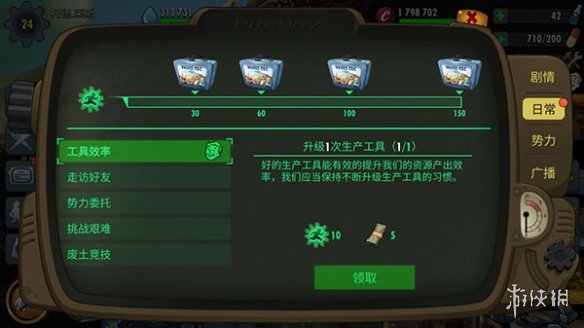 辐射避难所Online作为一款养成游戏,玩家每天完成日常任务,得到一定的活跃度都可以拿到一定的免费福利,下面我们就一起来看看,玩家每天都可以做哪些任务来累积活跃度吧。一、工具效率升级 1次生产工具进度值:10这个非常简单,只要升级一次生产类型居民的生产工具即可