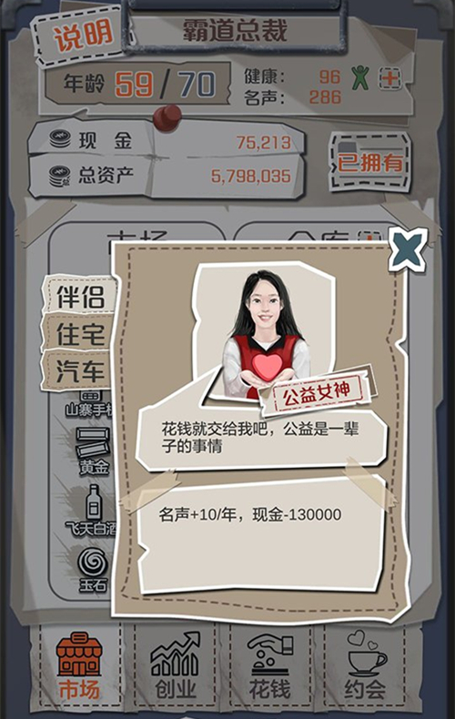 在一亿小目标手游中公益女神要怎么解锁呢?想必很多小伙伴们都不是很清楚公益女神的具体解锁方式,接下来就让小编来带着大家一起来看一下吧。一亿小目标公益女神解锁攻略公益女神触发条件:约会圣地有几率遇。解锁条件:名声达到250以上。解锁被动:每年名声增加十,现金减少十
