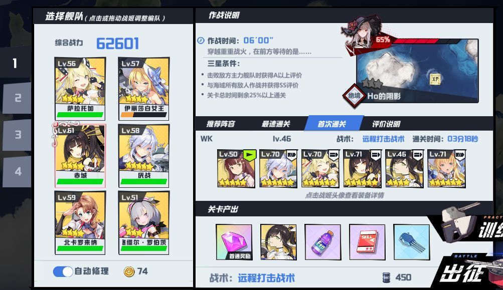苍蓝誓约不建议低于6.1W战力、手残党、意识不好和装备不齐的非洲提督打6-4,对判断、手操水平、时机把控要求极高,下面一起来看看平民6-4的攻略。感觉已经非常接近四星舰队的极限了,以我的打法预计6.1W战力输出应该足够,6W可能有些勉强主力舰队战姬一览:装备一