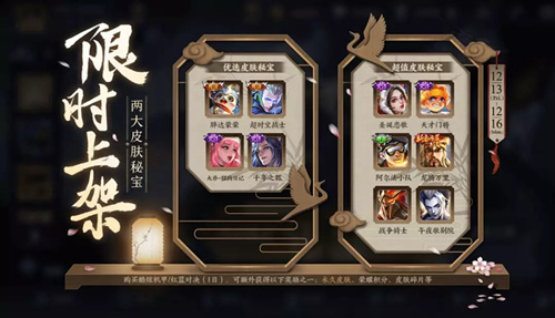 《王者荣耀》两大皮肤秘宝限时上架,那么具体都有哪些活动内容呢?想必很多的的小伙伴们都不是很清楚,下面游戏爱好者小编就给大家带来了王者荣耀两大皮肤秘宝内容一览,希望对大家有所帮助~王者荣耀两大皮肤秘宝内容一览超值皮肤秘宝购买红蓝对决(1日),可额外随机获得以下之一:貂蝉-圣诞恋歌、刘禅-天才门将、后羿-阿尔法小队、关羽-龙腾万里、夏侯惇-战争骑士、元歌-午夜歌剧院、荣耀积分*20、新品皮肤抽奖券*1