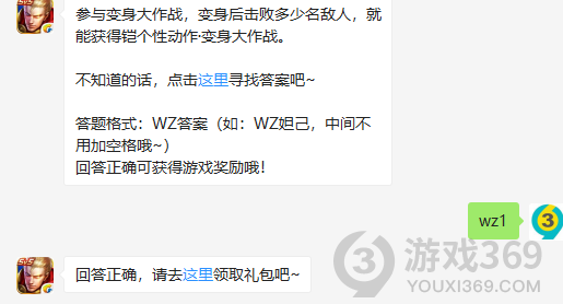 参与变身大作战,变身后击败多少名敌人,就能获得铠个性动作·变身大作战答题格式:WZ答案,10月27日王者荣耀每日一题的答案是什么?不知道的召唤师们,进来看看正确答案吧!回答正确即可领取妲己宝宝为大家准备的丰厚奖励了王者荣耀10月27日问题:参与变身大作战,变身