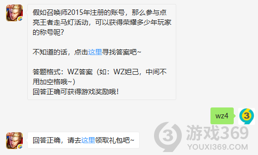 假如召唤师2015年注册的账号,那么参与点亮王者走马灯活动,可以获得荣耀多少年玩家的称号呢?答题格式:WZ答案,10月24日王者荣耀每日一题的答案是什么?不知道的召唤师们,进来看看正确答案吧!回答正确即可领取妲己宝宝为大家准备的丰厚奖励了王者荣耀10月24日问