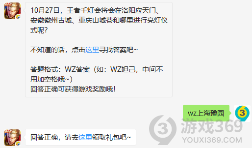 10月27日,王者千灯会将会在洛阳应天门、安徽徽州古城、重庆山城巷和哪里进行亮灯仪式呢?答题格式:WZ答案,10月25日王者荣耀每日一题的答案是什么?不知道的召唤师们,进来看看正确答案吧!回答正确即可领取妲己宝宝为大家准备的丰厚奖励了王者荣耀10月25日问题: