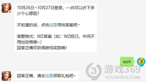 10月26日~10月27日登录,一共可以许下多少个心愿呢?答题格式:WZ答案,10月26日王者荣耀每日一题的答案是什么?不知道的召唤师们,进来看看正确答案吧!回答正确即可领取妲己宝宝为大家准备的丰厚奖励了王者荣耀10月26日问题:10月26日~10月27日登录