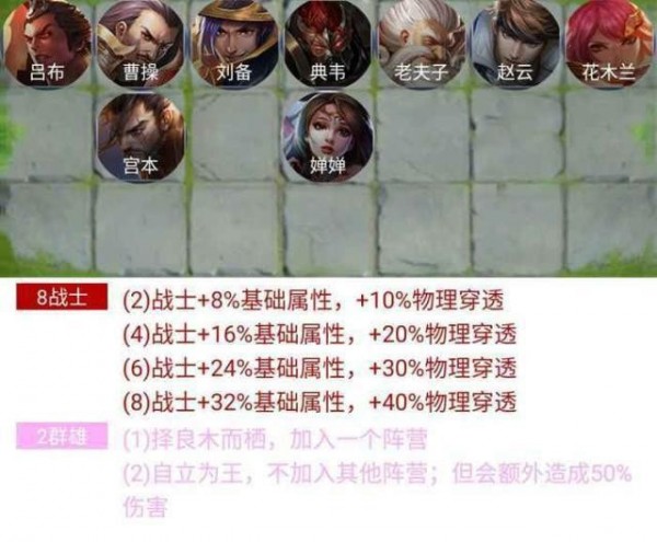?今天小编给大家带来王者模拟战8战士2群雄阵容站位推荐,感兴趣得小伙伴快来看看吧。群雄战士阵容搭配攻略一、英雄选择8战士:典韦,曹操,刘备,赵云,老夫子,花木兰(李信),宫本武藏,吕布2群雄:吕布,貂蝉2魏国:典韦,曹操王者模拟战了里面一共有9个战士,我们只需