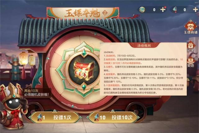 王者荣耀玉镖夺魁开启,玩家可以参与抽奖获取奖励内容,这里小编给大家带来了王者荣耀玉镖夺魁抽奖概率及奖励内容介绍,感兴趣的小伙伴不要错过,赶快来看一下吧!王者荣耀玉镖夺魁要抽吗活动时间:7.19-8.2,共15天。抽奖价格:60点券抽奖一次,600点券抽奖10次。抽奖后有几率获得:玉镖币,皮肤碎片,积分夺宝券,随机皮肤宝箱和随机传说皮肤宝箱,概率如下:王者荣耀玉镖夺魁要抽吗的分享已经结束,想要浏览更