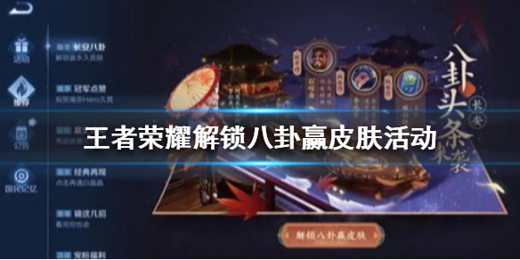在游戏中关于长安八卦的活动已经正式开始了,在这次活动中玩家有机会获得包括永久皮肤等等各种奖励,那么具体应该怎么玩呢?下面,游戏爱好者小编就为大家准备了关于这方面的详细攻略,一起来看看吧!王者荣耀解锁八卦赢皮肤活动怎么玩一共有三条主线,每走一条可以抽一次奖。也就是想抽三次必须玩三次才行,没法一次性顺路全领。几个支线小奖励是可以顺路领的。主地图在一个有天井的大四合院里,天井中没有有奖励的线索,奖励线索