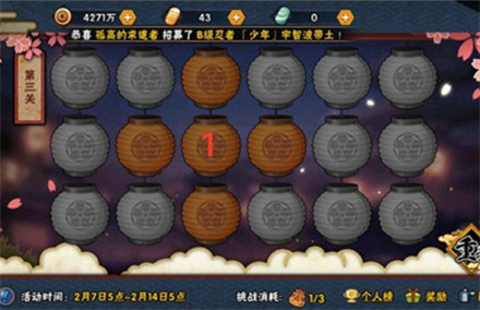 火影忍者花灯解谜第3关怎么过?想必很多的小伙伴们都不是很清楚,那么接下来,就跟随游戏爱好者小编一起来看一下《火影忍者花灯解谜第3关过关攻略》吧!感兴趣的小伙伴一定不要错过哦!火影忍者花灯解谜第3关过关攻略点击图中花灯1即可。这关基本就是教学关,直接点击中间的1就可以点亮灯笼通关了.这关活动主要的内容就是把灯笼点为十字亮光.以上就是游戏爱好者小编为大家带来的《火影忍者花灯解谜第3关过关攻略》,想要了