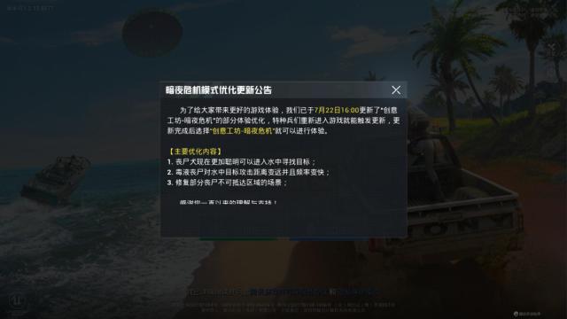 和平精英暗夜危机模式优化什么?更加带来战斗刺激,丧尸犬可进入水中。小编带来更新详情,提升对局参与!7月22日暗夜危机模式更新公告今日进行了6.75M的更新,需要注意的是6.75M的更新内容,只是安卓版本更新的大小,ios会有所不同。如图所示,《和平精英》主要更