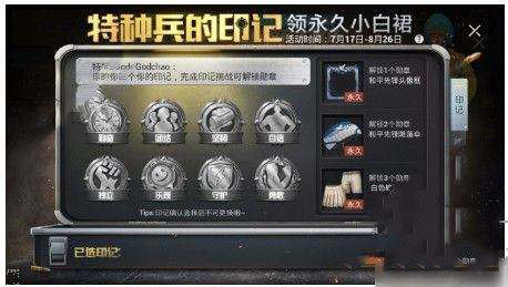 今天为大家介绍的文章是——和平精英特种兵的印记怎么获得,刷印记攻略,和平精英特种兵的印记怎么获得,刷印记攻略是小编为您推荐的和平精英相关游戏攻略,裙子本身在游戏中就是非常稀有的服装,特别是小白裙和小黑裙,基本上都是紫色或者红色品质的了,此次推出了活动,快来看看