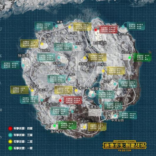 《和平精英》维寒迪资源那里多?这张地图里面的资源分配情况如何,哪里的比较多,跳哪里更好呢?下面就来一起看看吧! 《和平精英》雪地地图资源点大全 虽然资源点很多,但是非常肥的资源点只有两个,且危险系数很高。 红色是资源大点,黄