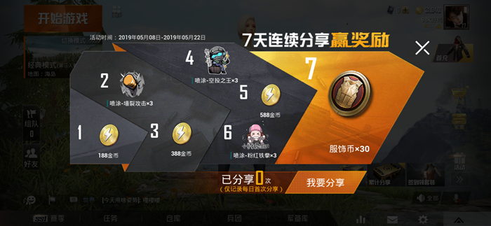 和平精英5月8日上线,下载进入游戏获取海量福利,本文小编就带来7天分享奖励,下面一起来看看吧! 《和平精英》7天连续分享奖励一览 进入游戏点击分享即可获得丰富奖励~ 以上就是关于《和平精英》7天连续分享奖励一览的全部内容,更多精彩资讯尽在游戏爱好者!