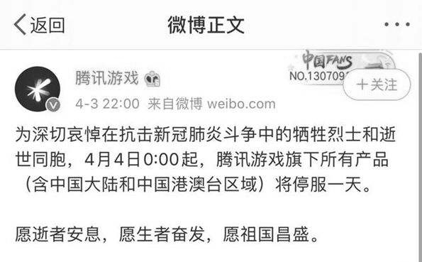 4月3日晚间消息,腾讯官方发布,为深切哀悼在抗击新冠肺炎斗争中的牺牲烈士和逝世同胞,4月4日0:00起,和平精英将停服一天。当然了,玩家们如果觉得明天一整天无聊的话,到是可以在手机中下载一些单机游戏,因为单机游戏是不会停服的,也是可以作为消遣,或者在手机上找好明天要看的电视剧或者电影等等。届时,为表达全国各族人民对抗击新冠肺炎疫情斗争牺牲烈士和逝世同胞的深切哀悼,国务院决定,2020年4月4日举行