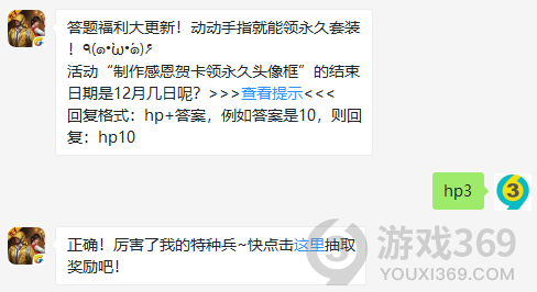 答题福利大更新!动动手指就能领永久套装!٩(๑•̀ω•́๑)۶活动制作感恩贺卡领永久头像框的结束日期是12月几日呢?回复格式:hp+答案,11月29日和平精英每日一题的答案是什么?不知道的特种兵们,进来看看正确答案吧!回答正确即可领取鸡仔为大家准备的丰厚奖励了