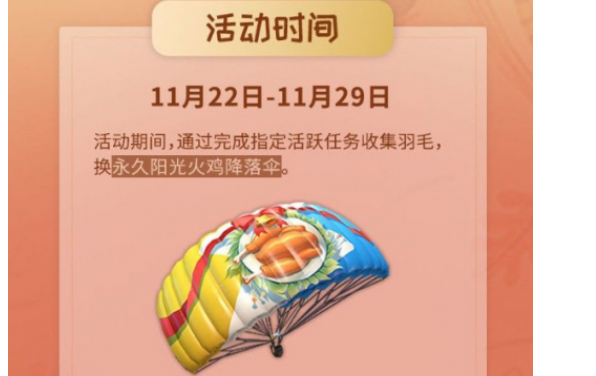 感恩节期间游戏都会有相应的活动产出,所以和平精英在这次感恩节活动中送出永久阳光火鸡降落伞作为活动奖励,那么这个降落伞要怎么获得呢?和平精英永久阳光火鸡降落伞怎么获得?马上就要到感恩节了,官方也推出了一系列的活动,这个永久阳光火鸡降落伞也是这次活动的奖励,本次获