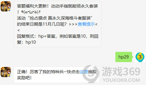 答题福利大更新!动动手指就能领永久套装!٩(๑•̀ω•́๑)۶活动抢占据点赢永久深海格斗者服装的结束日期是11月几日呢?回复格式:hp+答案,11月27日和平精英每日一题的答案是什么?不知道的特种兵们,进来看看正确答案吧!回答正确即可领取鸡仔为大家准备的丰厚奖