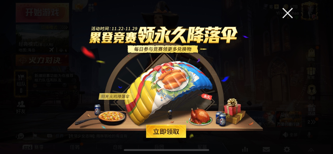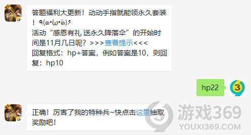 答题福利大更新!动动手指就能领永久套装!٩(๑•̀ω•́๑)۶活动感恩有礼送永久降落伞的开始时间是11月几日呢?回复格式:hp+答案,11月24日和平精英每日一题的答案是什么?不知道的特种兵们,进来看看正确答案吧!回答正确即可领取鸡仔为大家准备的丰厚奖励了和平