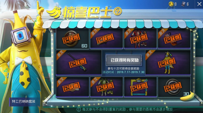 和平精英特工巴纳纳套装如何获取?这是一款造型十分奇特的服装,小编这里带来了和平精英特工巴纳纳套装获得方法,感兴趣的玩家们就一起来看看吧!和平精英特工巴纳纳套装获得方法通过香蕉币进行转盘抽取,每次抽取都必得一个奖励,而且奖励不会重复,参与十次就必得特工巴纳纳套装,但是每次抽所消耗的香蕉币也会递增。也就是说我们要尽量的获取香蕉币来抽,而香蕉币目前只能通过充值来获得,每个香蕉币需要10点券获得,抽的次数