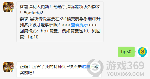 答题福利大更新!动动手指就能领永久套装!٩(๑•̀ω•́๑)۶套装黑夜传说需要在SS4精英赛季手册中升到多少级才能解锁呢?回复格式:hp+答案,11月3日和平精英每日一题的答案是什么?不知道的特种兵们,进来看看正确答案吧!回答正确即可领取鸡仔为大家准备的丰厚奖