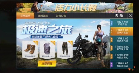 和平精英极速之旅奖励什么?收集汽油前进,达到规定步数。小编带来活动内容,快速进行参与。永久野性战魂套装获取方法攻略活动时间:9月30号到10月13号。活动奖励:永久野性战魂套装三件套(上衣、裤子、鞋子)。活动玩法:进入活动之后,点“立即前往”,会进入活动游戏界