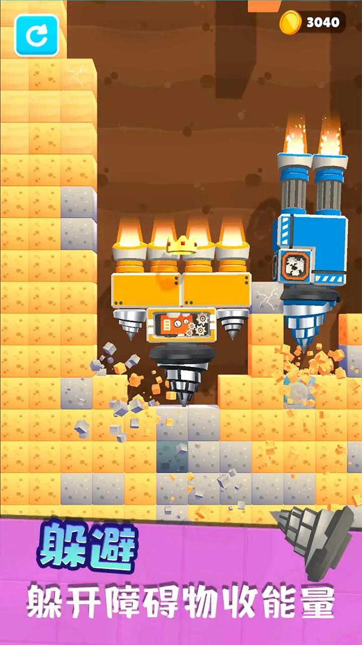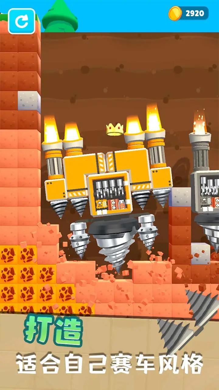 组装钻地机只要能快速的钻到终点就算过关,想要每场比赛都能战胜敌人就必须要升级和改装自己的战车,遇到钻地困难可以使用道具化解。