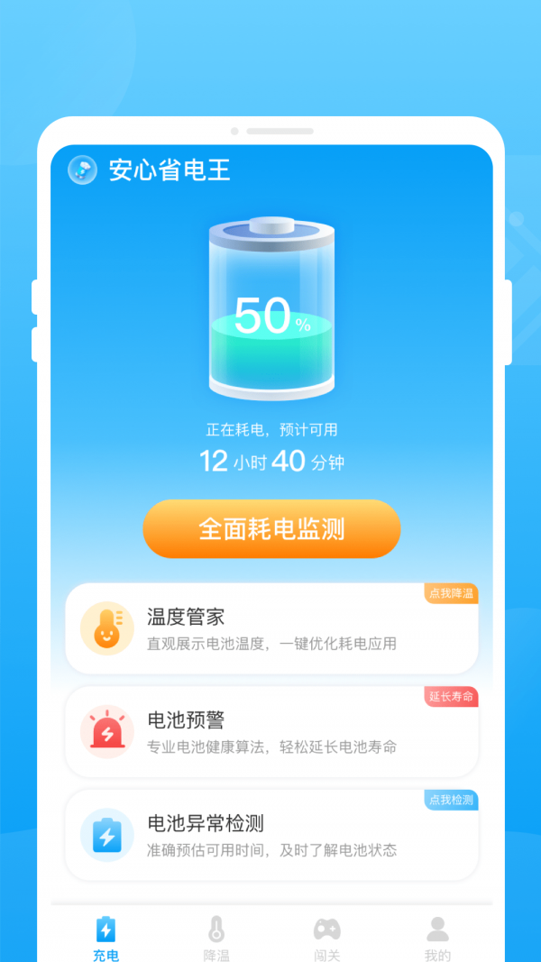 安心省电王app作为一款功能非常强大的省电工具,能够延长手机电量的使用时长,为小伙伴们带来更加优质的手机使用体验。软件还会为用户们显示所有应用的耗电情况,还会对手机的后台进行优化。同时可以在手机充电时智能地进行降温,避免手机温度过高对电池寿命造成影响,更好地保护手机电池的安全。