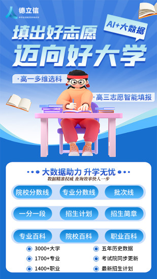 德立信生涯是一个教育规划服务软件,用户可以在线查看升学规划,很多的深度数据解析可以去查看,自由在线填写志愿名单,让你可以更加坚定的选择喜欢的大学,自己的规划生涯都可以提前安排好,效率都非常的高,教育数据都可以在线查询,非常的高效。