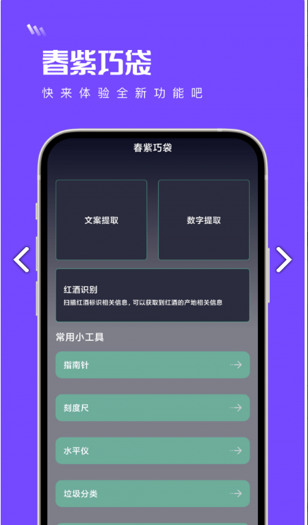 春紫巧袋是一个使用的手机工具箱软件,里面的功能可以解决日常各种小问题,定位导航,内容识别,编辑信息,修图都是有的,功能都划分的详细,一个工具箱可以让你轻松使用手机,功能模块都划分的详细,甚至比自带的应用还要实用,操作简单。