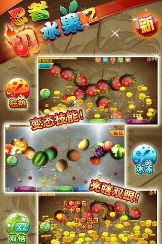 忍者切水果2是一款将切水果高大上化了的休闲娱乐类游戏,游戏中色彩鲜艳的水果盛宴,多种游戏玩法结合,还加入了各种形式的忍者们哟。