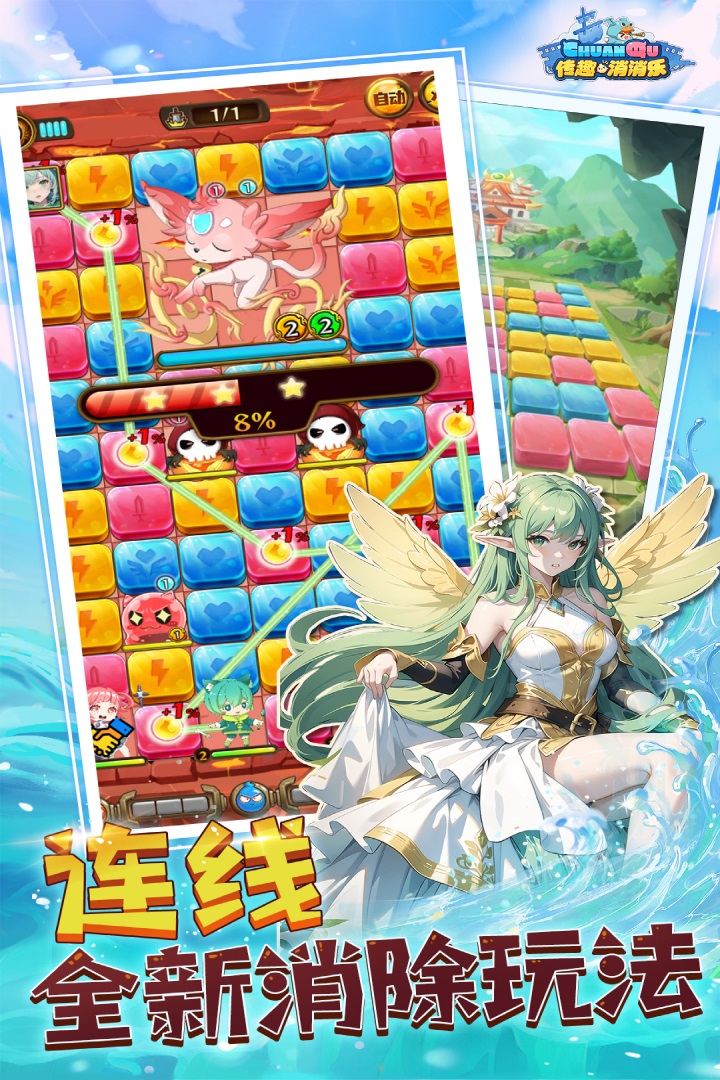 传趣消消乐是一个方块消除挑战类游戏,每关都有复杂的方块堆积在一起,玩家要将这些方块都消除掉,找到相同颜色的方块连接在一起就可以消除了,可以动用角色的技能来加快消除的进度,消除所有的方块就可以过关,还可以领取到超多的奖励,玩法休闲。