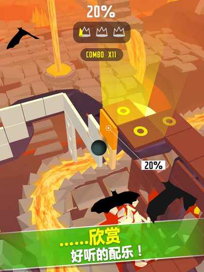 每个关卡都是在你眼前建造的迷宫。要想预测接下来会出现什么,以及对蜿蜒曲折的形势做出反应,你必须仔细听音乐。旋律的节奏是游戏内容的关键。