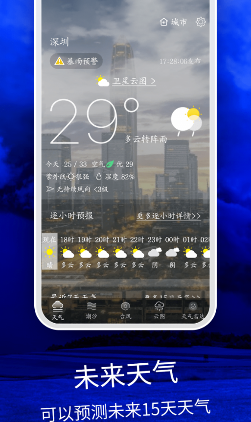 天气云图app汇集了来自全球的气象信息,小伙伴们可以随时查询自己所处城市的天气变化情况,让小伙伴们可以提前做好出行准备。软件提供的天气信息十分精准,能够带来未来15天的天气变化情况,包含了温度变化、空气质量、pm2.5指数等等。有任何恶劣天气信息也可以第一时间知晓,让小伙伴们可以更改自己的出行计划,为出行安全提供了极大的保障。