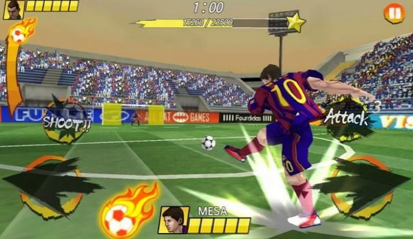 奔跑射门是一款体育竞技类手机游戏,在游戏中我们将带着球向着球门前进,在过程中,我们会遇到了很多人来倒地抢你的球,我们要做的就是躲避他们,将球射进球门!