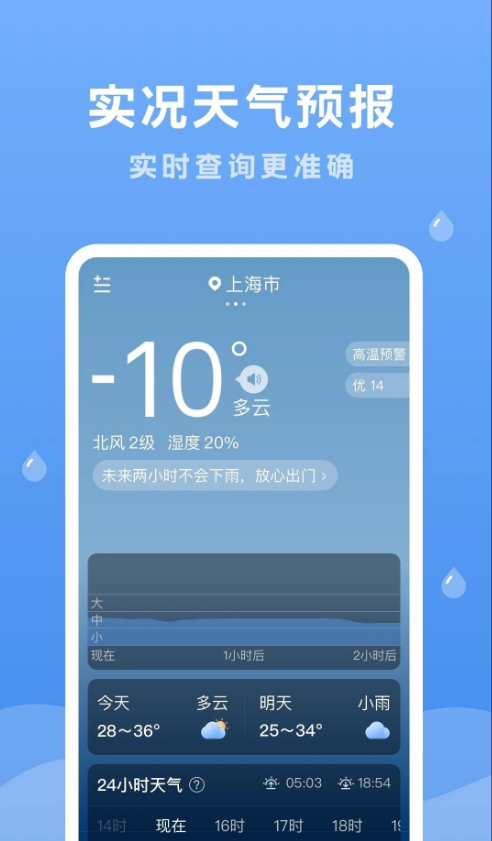 实时天气查询:可以随时随地查询当前位置的实时天气情况,包括温度、湿度、风向等信息