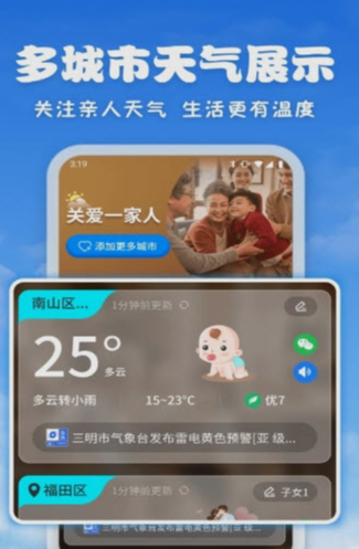 亲情天气app不仅提供精准的气象信息服务,还融入了温馨的家庭元素。用户可以通过该软件为不同家庭成员定制专属的天气提醒,无论家人身在何处,都能感受到彼此的关心与温暖。其独特的情感化设计与动态天气背景,使得每次查看天气都成为一种享受。