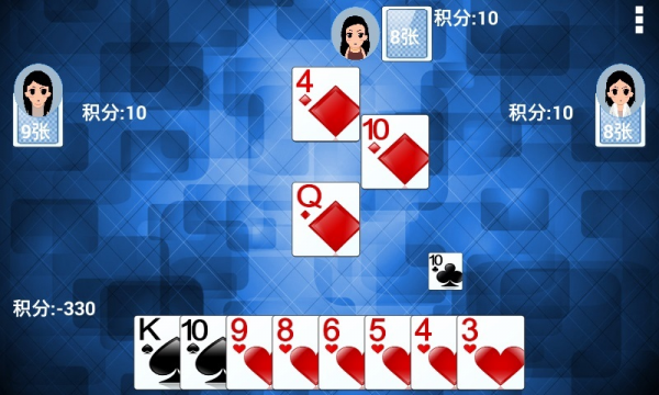3. 得分与扣分:在游戏中,玩家需要根据出牌的牌型和花色来得分或扣分。有时候一张牌就能得到很多分,有时候一张牌会扣掉很多分,这需要玩家对游戏规则有深入的了解和把握。
