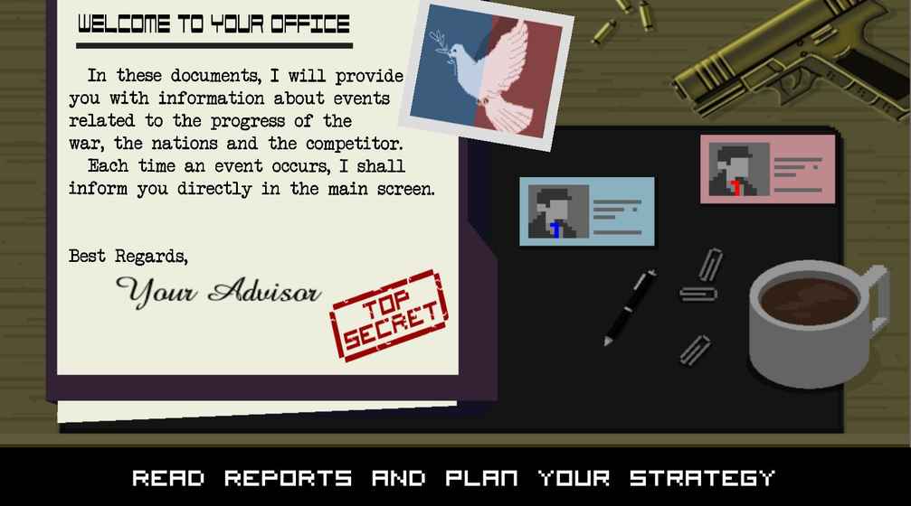 《战争代理人》是一款具有反思意义的策略攻防游戏,也可以看成模拟经营。你经营的不再是游戏,而是一场战争。两个国家间的战争已经迫在眉睫,但是奸商的加入让这场战争处处充满着赚钱的机会,只是代价可能非常惨烈。游戏中可以贿赂政府,给媒体提供金钱以掩盖牺牲的人口数量,还有超过10种不同的随机事件。