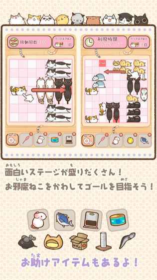 操作自己喜欢的喵咪,把阻碍的猫滑移开引领喵咪到终点。通关之后会追加“帮助道具”。也可以联动Facebook与朋友竞争。