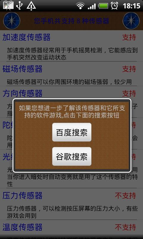 指南(北)针是中国古代的四大发明之一,它根据地磁场来辨别方向。指北针不受时间和空间影响可以为您指明方向,出门不再找不着北。您还可以根据喜好改变模式和更换罗盘。另外本程序还提供了检测你手机支持哪些传感器的功能,从而你可以在应用程序商店下载您手机支持的有趣的传感器软件