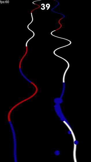 2、游戏以红线蓝线曲线为背景,蓝色小球在曲线上蜿蜒前行,躲避不同颜色曲线过关;