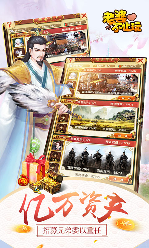 《老婆不让玩》是一款画面超赞的经营养成类RPG,玩家将穿越到古代,开始属于你的全新生活,运筹帷幄来共创属于你的霸业,更有各色美人佳丽等你来邂逅,直接迎娶宠幸,快来下载吧!