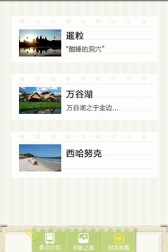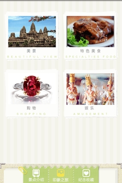 简单介绍:旧称高棉,是位于东南亚中南半岛的一个国家,首都金边。该国西部及西北部与泰国接壤,东北部与老挝交界,东部及东南部与越南毗邻,南部则面向暹罗湾。详细介绍:本应用中介绍了柬埔寨几处风景点,以及柬埔寨的地方特色美食、购物和娱乐••• 【本软件来制作于应用公园:http://www. apppark.cn】