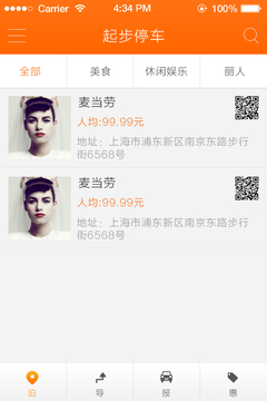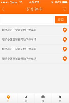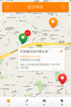 停车泊导以迅速寻找到可用的停车场为亮点,以为车主提供便捷服务为目的的APP,该APP主要功能为“泊”“导”“报”“惠”,用户可在“泊”功能中迅速查找到目的地周边的停车场,并正确的获得停车场的收费、入口点、实时状态等信息;用户可通过“导”功能,规划出最佳的行车路线;用户可通过“报”功能,分享新发现的停车场或者对APP中的停车场错误信息进行上报;用户可通过“惠”功能,寻找到目的地周边的感兴趣的商家优惠信息。