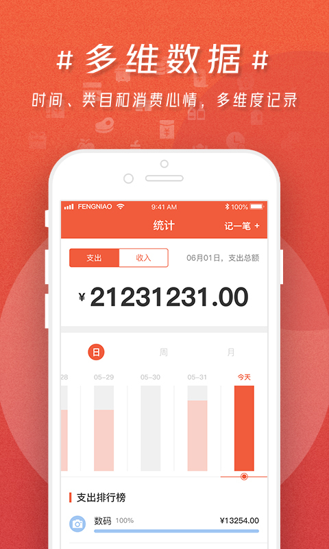 【图表统计】记录您支出和收入的总数据、消费分类以及消费心情;