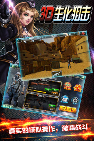 《3D生化狙击》是一款全新的第一人称视角射击游戏, 本作不仅全面加强了游戏的画面质感、武器、人物、场景等细节,还增加了全新的生化模式,无边无尽的尸海狂潮,爽快无边的超爽打击!尽在《3D生化狙击》,最好玩的手游CF,快来一起狙击吧!