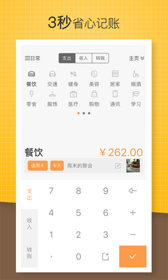 1、3秒快速记账:打开即会的精巧记账工具,只需3秒,一步到位;