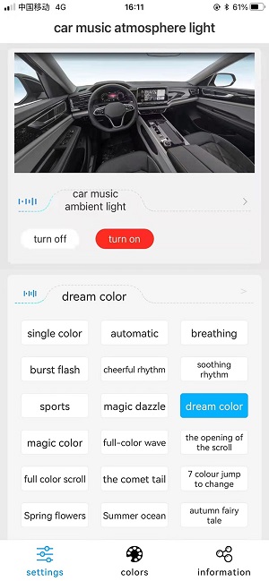 1. 个性化设置:支持用户自定义颜色、亮度和节奏,打造独一无二的车内氛围。