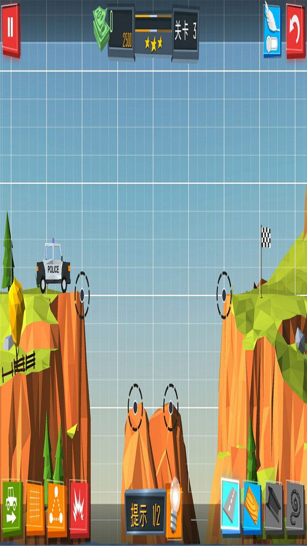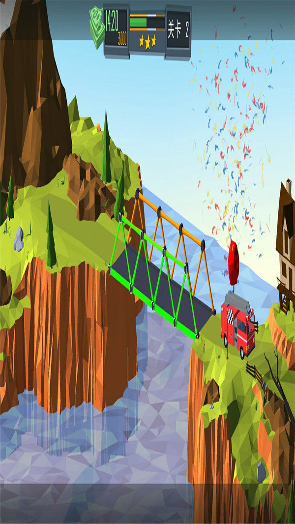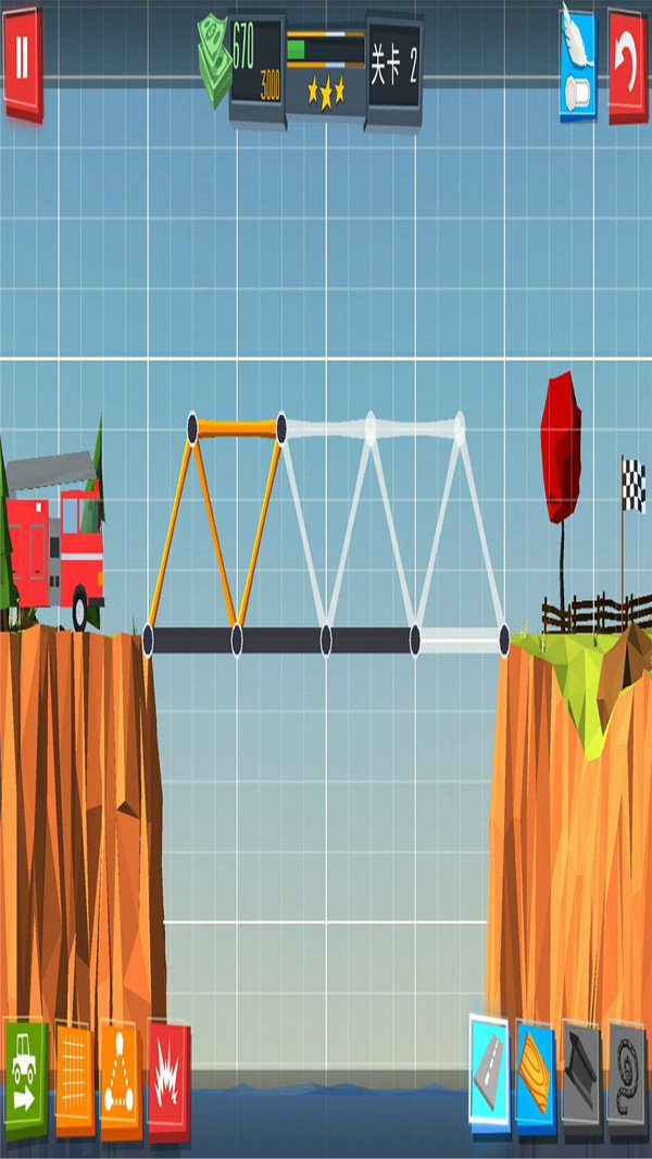 4. 关卡挑战:游戏设有多样化的关卡,每个关卡都有不同的地形和难度,玩家需要综合考虑桥梁的结构、材料使用、预算限制等因素,成功建造出符合要求的桥梁。